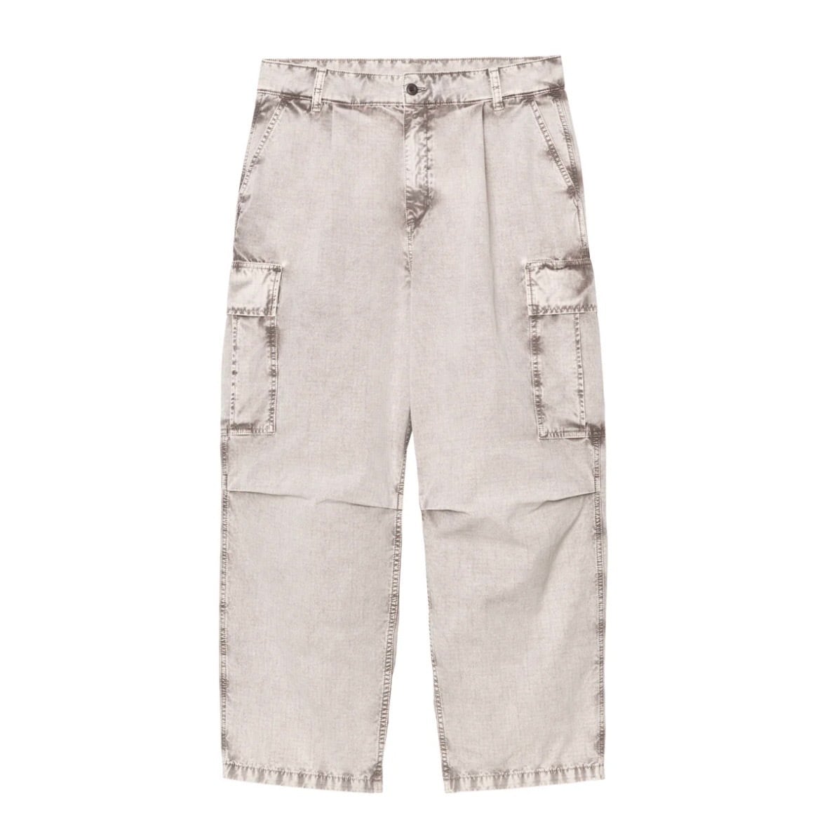 コールカーゴパンツは、ミディアムウェイトのコットンリップストップ生地を使用しており、チョークウォッシュ加工を施すことで、ヴィンテージ風でパウダーのような仕上がりに仕上げられています。フロントにはプリーツ、脚の後ろ側にはダーツが施されたデザインが特徴です。パンツの後ろとサイドにはポケットが配置され、負荷がかかる重要な箇所にはバータックステッチが施され、耐久性を高めています。ウォッシュ加工によってくすんだ風合いになったスクエアラベルが、デザインを引き立てています。